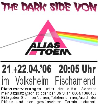 WAS WAR LOS MIT ALIAS TOEM? (eine musikalische Informationsveranstaltung) Es war ein kleiner Rückblick auf die 25-jährige Bandgeschichte mit G'schichtln, Statistiken und jeder Menge Musik – natürlich durften die „Alt-Toems“ Manfred und Herbert nicht fehlen. Wir haben uns aber auch um die Zukunft Gedanken gemacht und in diesem Sinne eine Nachwuchsmusikerin „Next Toem“ Kathi zu Gast gehabt. Herbert zauberte eine tolle Lichtshow. An allen drei Abenden hatten wir ein volles Haus und eine tolle Stimmung – nach dem Motto: Alias Toem - und alles wird gut! |
