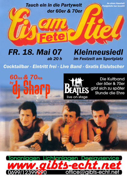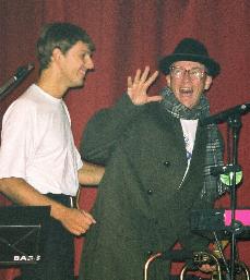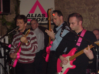 Konzert im Stand Up Club Fischamend. Unser treues Privatpublikum half uns aus der Verlegenheit mehr Menschen auf der Bühne als im Saal zu haben. Besonders gut paßte das Ambiente auf der Bühne zum »Beach Boys Medley«, da der klebrige Boden fatal an das grausliche Sonnenöl erinnerte. |